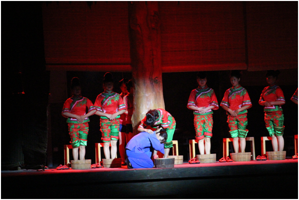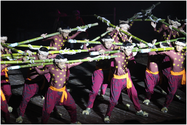 整場實景演出,以國家級非物質文化遺產“川江號子”為主線,開場就引出了“川江號子”,并通過聲情并茂的朗誦配音演繹,勾起了觀眾對川江文化的回憶,帶著大家進入了歷史長河。實景演出中穿插了:抬滑竿、火鍋交響曲、纖夫精神、出嫁、孝道等重慶本土文化,通過現場3D激光和玄幻燈光的配合,完全展現了中國歷史文化的博大、中國人民不屈不撓的精神和尊老愛幼的傳統美德。